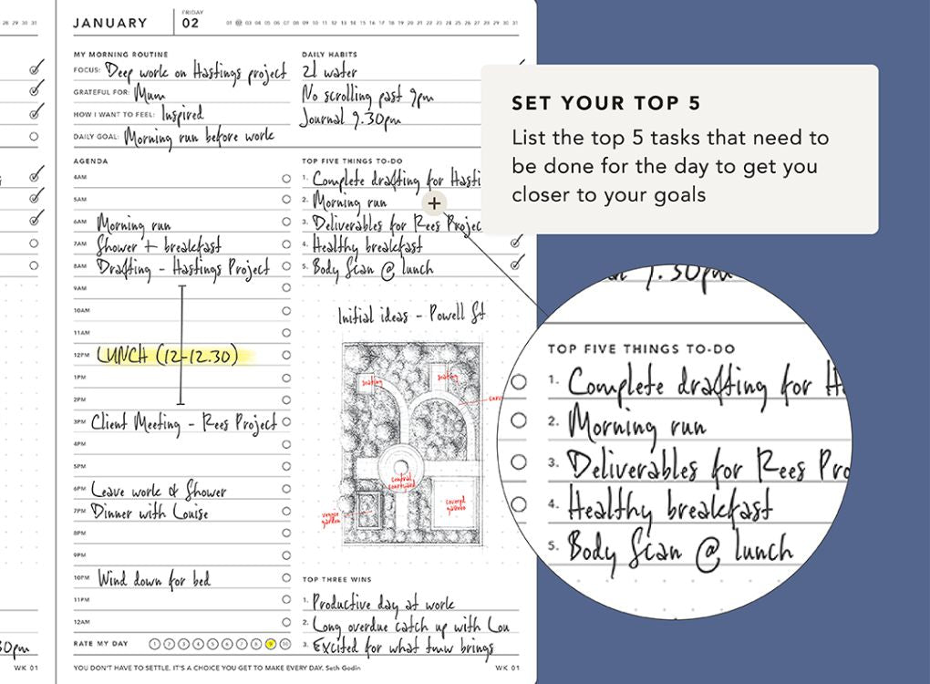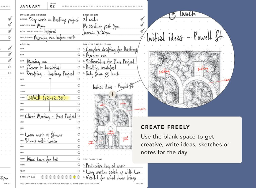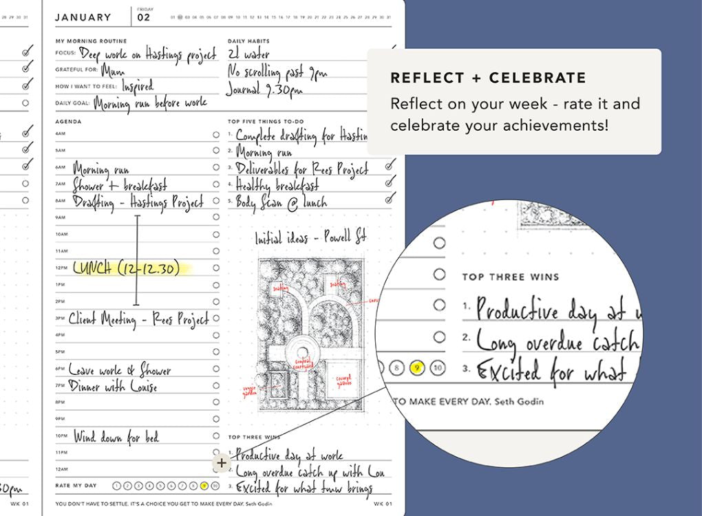 The DAILY Goal Digger has a day to a page layout meaning you can effectively plan and execute everyday. Think of it as your personal life coach that keeps you focused on your goals, encourages you to create positive habits and empowers you to take action towards achieving your dreams.